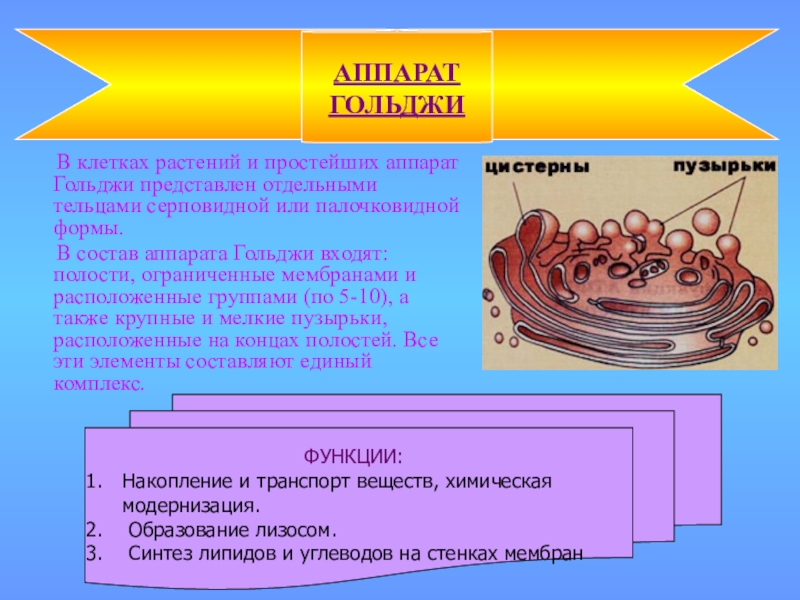 В клетках растений и простейших аппарат Гольджи представлен отдельными тельцами серповидной или палочковидной формы.