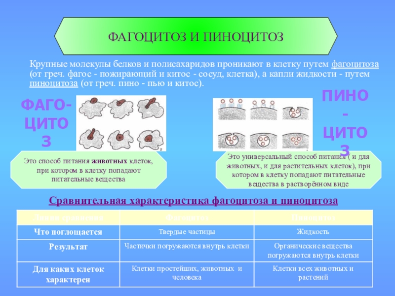 Сравнительная характеристика фагоцитоза и пиноцитозаФАГОЦИТОЗ И ПИНОЦИТОЗ   Крупные молекулы белков и полисахаридов проникают в клетку