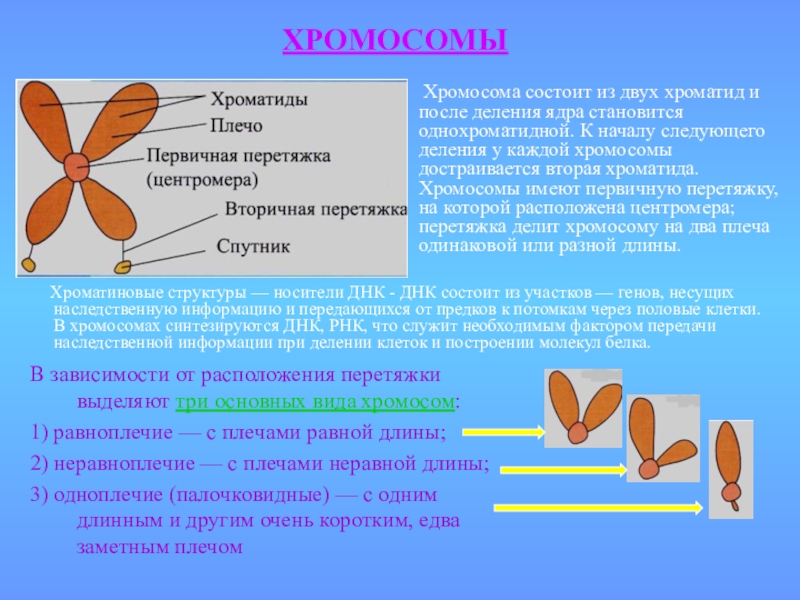 деления ядра становится однохроматидной. К началу следующего деления у каждой хромосомы достраивается вторая хроматида. Хромосомы имеют первичную перетяжку, на которой расположена центромера; перетяжка делит хромосому на два плеча одинаковой или разной длины.
