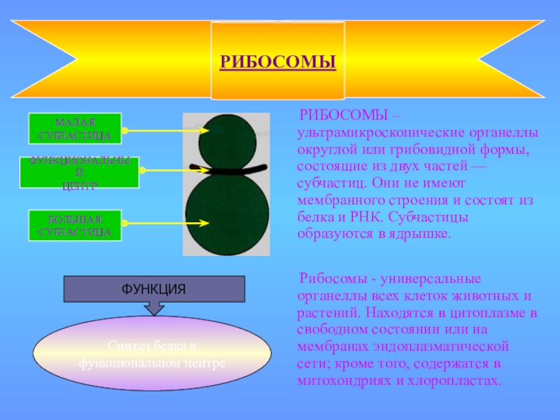 РИБОСОМЫ – ультрамикроскопические органеллы округлой или грибовидной формы, состоящие из двух частей — субчастиц.