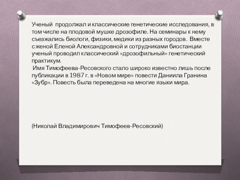 мушке дрозофиле. На семинары к нему съезжались биологи, физики, медики из разных городов. Вместе с женой Еленой Александровной и сотрудниками биостанции ученый проводил классический «дрозофильный» генетический практикум.