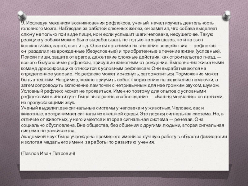 Наблюдая за работой слюнных желез, он заметил, что собака выделяет слюну не только при виде пищи, но и если услышит шаги человека, несущего ее. Такую реакцию у собаки можно было вырабатывать не только на звук шагов, но и на звон колокольчика, запах, свет и т.д. Ответы организма на внешние воздействия — рефлексы — он разделил на врожденные (безусловные) и приобретенные в течение жизни (условные). Поиски пищи, защита от врагов, даже такие сложные действия, как строительство гнезд, — все это безусловные рефлексы, присущие животным от рождения. Выполнение животными команд дрессировщика относится к условным рефлексам. Они вырабатываются на определенное условие. Но рефлекс может исчезнуть, затормозиться. Торможение может быть внешним. Например, можно приучить собак к кормлению на включение лампочки, а затем сопроводить включение лампочки с непривычным для нее громким звуком, шумом. Условный рефлекс может не проявиться. Именно поэтому для опытов с условными рефлексами в институте было выстроено особое здание — «Башня молчания» со стенами, не пропускающими звук.