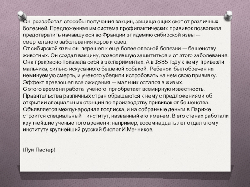 Слайд 13Он разработал способы получения вакцин, защищающих скот от различных болезней. Предложенная