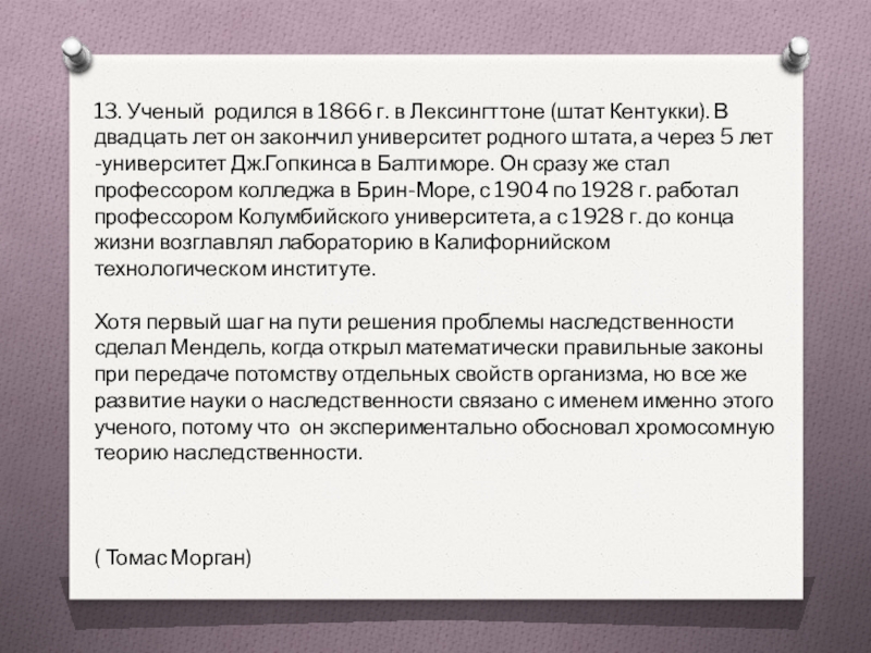Хотя первый шаг на пути решения проблемы наследственности сделал Мендель, когда открыл математически правильные законы при передаче потомству отдельных свойств организма, но все же развитие науки о наследственности связано с именем именно этого ученого, потому что он экспериментально обосновал хромосомную теорию наследственности.