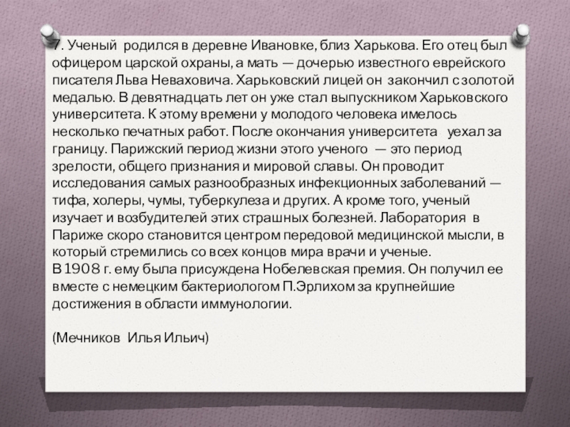 офицером царской охраны, а мать — дочерью известного еврейского писателя Льва Неваховича. Харьковский лицей он закончил с золотой медалью. В девятнадцать лет он уже стал выпускником Харьковского университета. К этому времени у молодого человека имелось несколько печатных работ. После окончания университета уехал за границу. Парижский период жизни этого ученого — это период зрелости, общего признания и мировой славы. Он проводит исследования самых разнообразных инфекционных заболеваний — тифа, холеры, чумы, туберкулеза и других. А кроме того, ученый изучает и возбудителей этих страшных болезней. Лаборатория в Париже скоро становится центром передовой медицинской мысли, в который стремились со всех концов мира врачи и ученые.