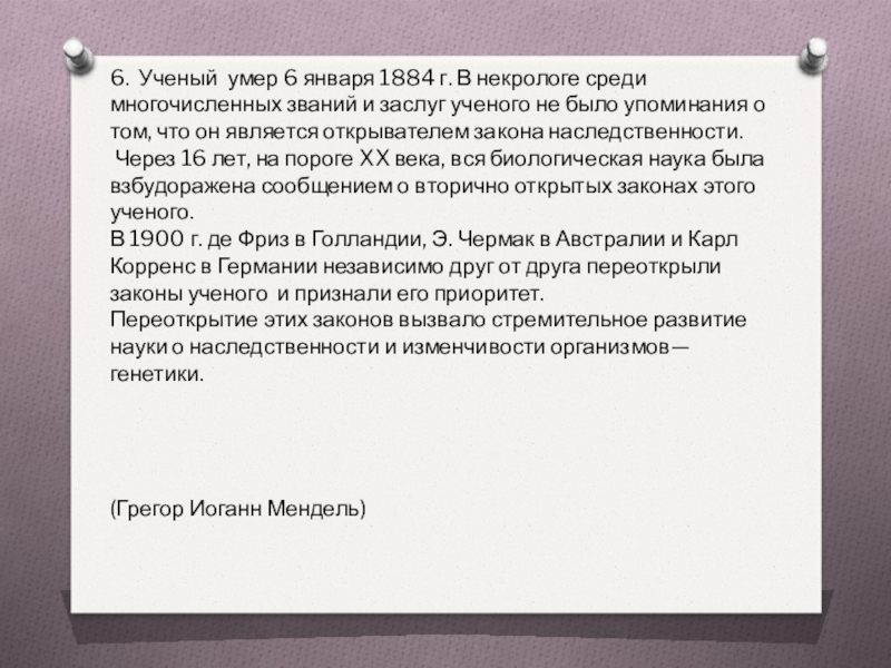 званий и заслуг ученого не было упоминания о том, что он является открывателем закона наследственности.