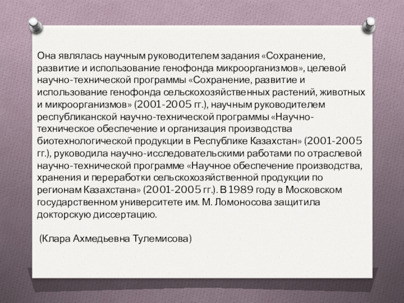 целевой научно-технической программы «Сохранение, развитие и использование генофонда сельскохозяйственных растений, животных и микроорганизмов» (2001-2005 гг.), научным руководителем республиканской научно-технической программы «Научно-техническое обеспечение и организация производства биотехнологической продукции в Республике Казахстан» (2001-2005 гг.), руководила научно-исследовательскими работами по отраслевой научно-технической программе «Научное обеспечение производства, хранения и переработки сельскохозяйственной продукции по регионам Казахстана» (2001-2005 гг.). В 1989 году в Московском государственном университете им. М. Ломоносова защитила докторскую диссертацию.