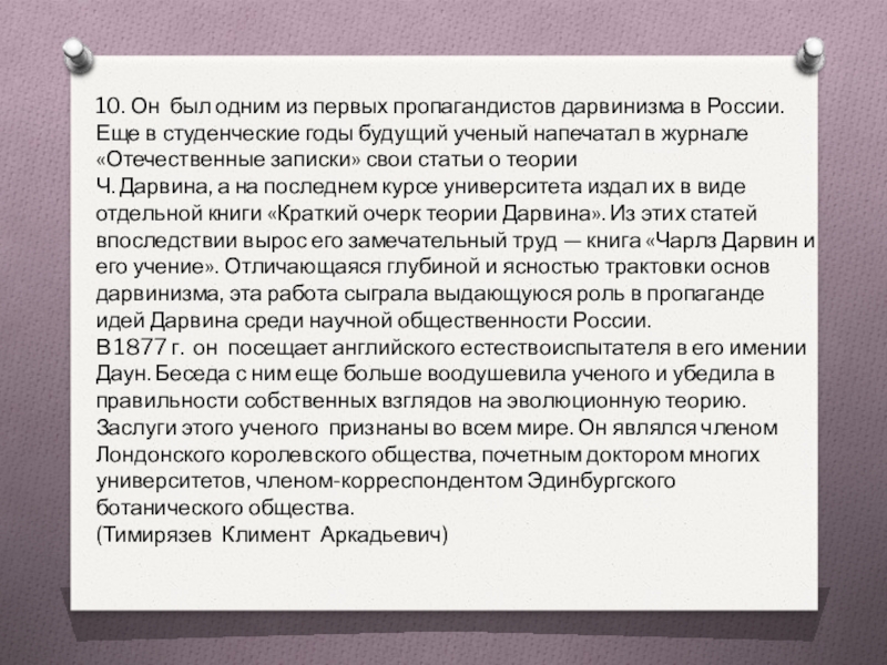 Слайд 1110. Он был одним из первых пропагандистов дарвинизма в России. Еще