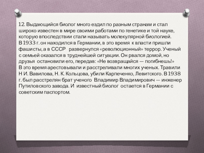 Слайд 1412. Выдающийся биолог много ездил по разным странам и стал широко
