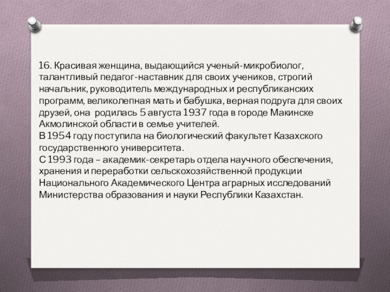 Слайд 2116. Красивая женщина, выдающийся ученый-микробиолог, талантливый педагог-наставник для своих учеников, строгий