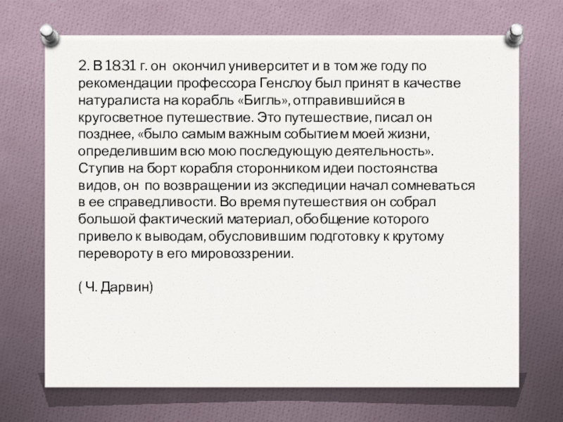 году по рекомендации профессора Генслоу был принят в качестве натуралиста на корабль «Бигль», отправившийся в кругосветное путешествие. Это путешествие, писал он позднее, «было самым важным событием моей жизни, определившим всю мою последующую деятельность». Ступив на борт корабля сторонником идеи постоянства видов, он по возвращении из экспедиции начал сомневаться в ее справедливости. Во время путешествия он собрал большой фактический материал, обобщение которого привело к выводам, обусловившим подготовку к крутому перевороту в его мировоззрении.
