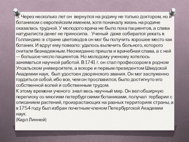но и ботаником с европейским именем, хотя поначалу жизнь на родине оказалась трудной. У молодого врача не было пока пациентов, а слава натуралиста денег не приносила. Ученый даже собирался уехать в Голландию: в стране цветоводов он мог бы получить хорошее место как ботаник. И вдруг ему повезло: удалось вылечить больного, которого считали безнадежным. Неожиданно пришла и врачебная слава, а с ней — большое число пациентов. Но молодому ученому хотелось заниматься научной работой. В 1741 г. он стал профессором в родном Упсальском университете, а вскоре и первым президентом Шведской Академии наук, был удостоен дворянского звания. Он мог заслуженно гордиться собой, ибо все, чем он прославился, было достигнуто его собственной волей и собственным трудом.