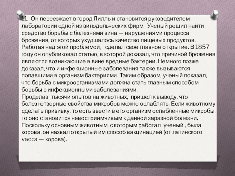из винодельческих фирм. Ученый решил найти средство борьбы с болезнями вина — нарушениями процесса брожения, от которых ухудшалось качество пищевых продуктов. Работая над этой проблемой, сделал свое главное открытие. В 1857 году он опубликовал статью, в которой доказал, что причиной брожения являются возникающие в вине вредные бактерии. Немного позже доказал, что и инфекционные заболевания также вызываются попавшими в организм бактериями. Таким образом, ученый показал, что борьба с микроорганизмами должна стать главным способом борьбы с инфекционными заболеваниями.