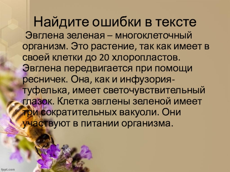 Найдите ошибки в тексте	Эвглена зеленая – многоклеточный организм. Это растение, так как имеет в своей клетки до