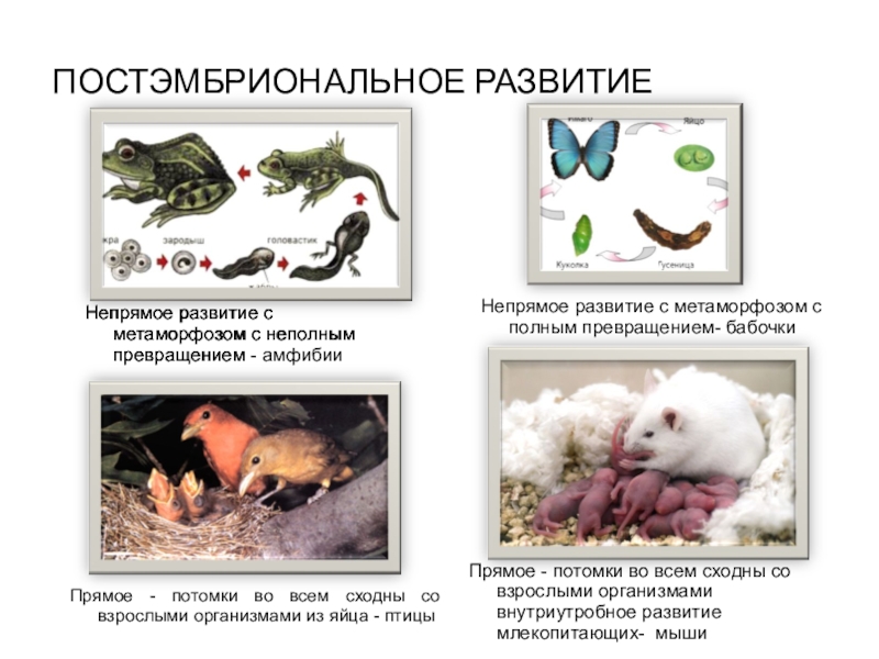 Прямое - потомки во всем сходны со взрослыми организмами внутриутробное развитие млекопитающих- мыши