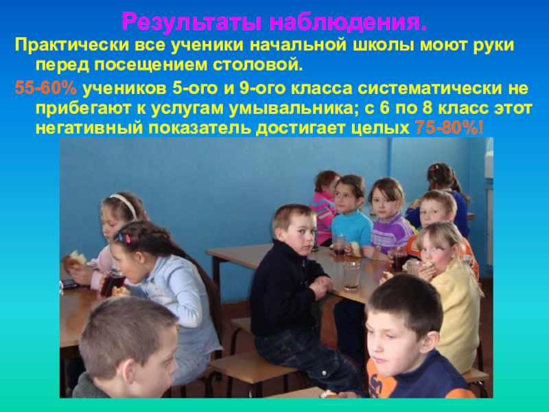55-60% учеников 5-ого и 9-ого класса систематически не прибегают к услугам умывальника; с 6 по 8 класс этот негативный показатель достигает целых 75-80%!