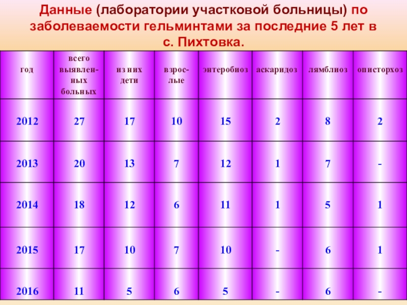 Слайд 59Данные (лаборатории участковой больницы) по заболеваемости гельминтами за последние 5 лет