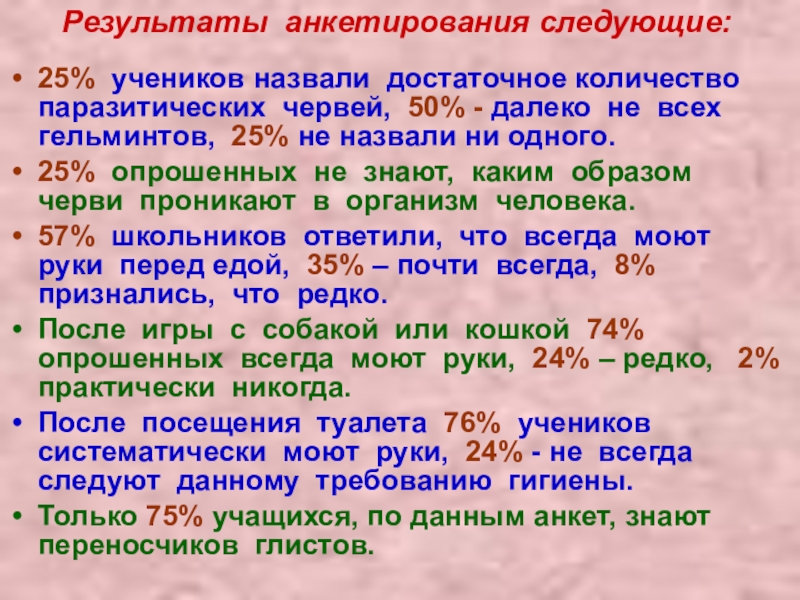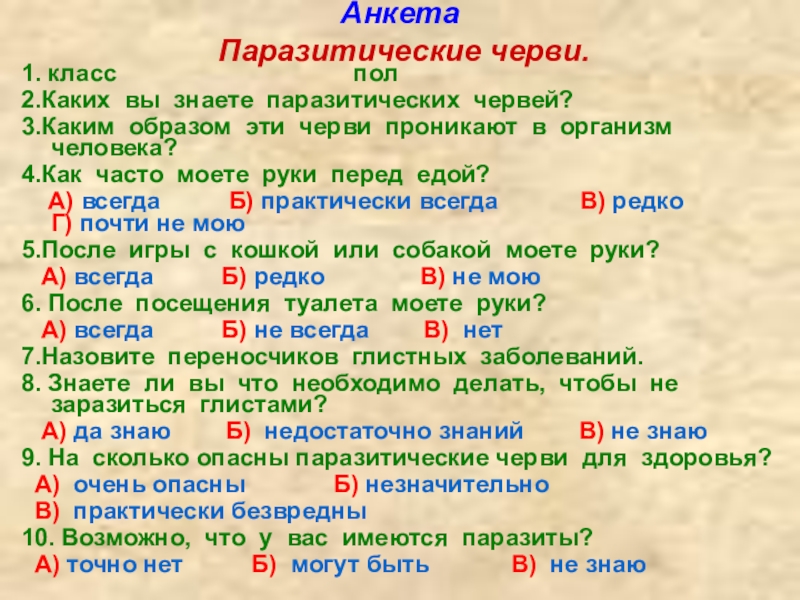 выявить уровень знаний по вопросам, связанным с заражением паразитическими червями;
