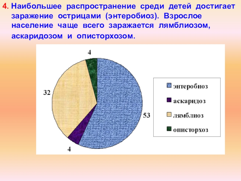 4. Наибольшее распространение среди детей достигает заражение острицами (энтеробиоз). Взрослое население