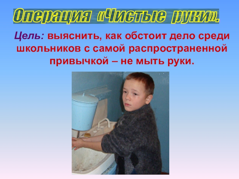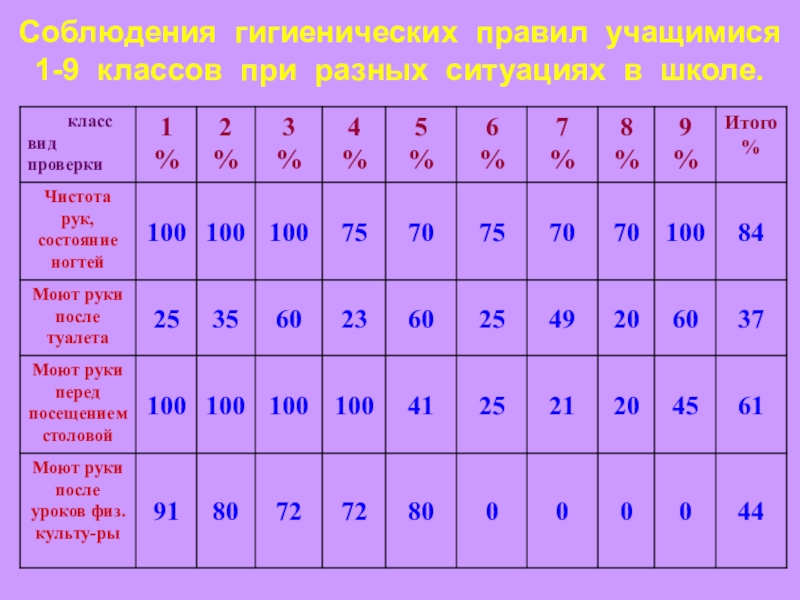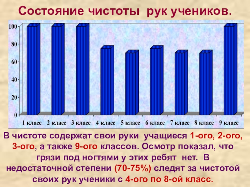 3-ого, а также 9-ого классов. Осмотр показал, что грязи под ногтями у этих ребят нет. В недостаточной степени (70-75%) следят за чистотой своих рук ученики с 4-ого по 8-ой класс.
