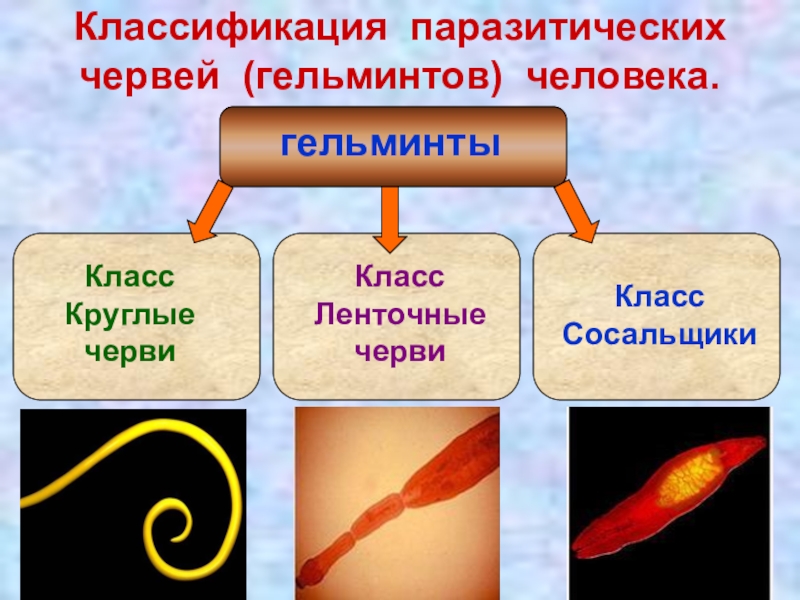 Слайд 7Классификация паразитических червей (гельминтов) человека.