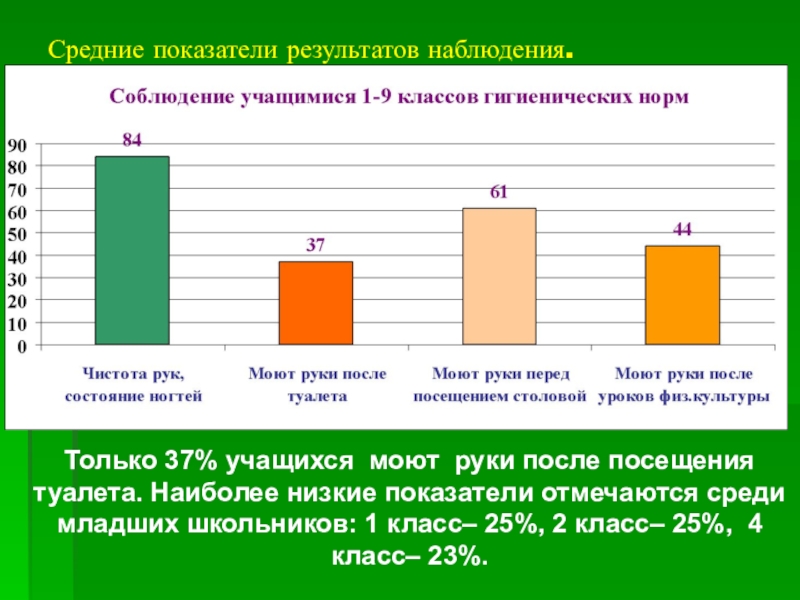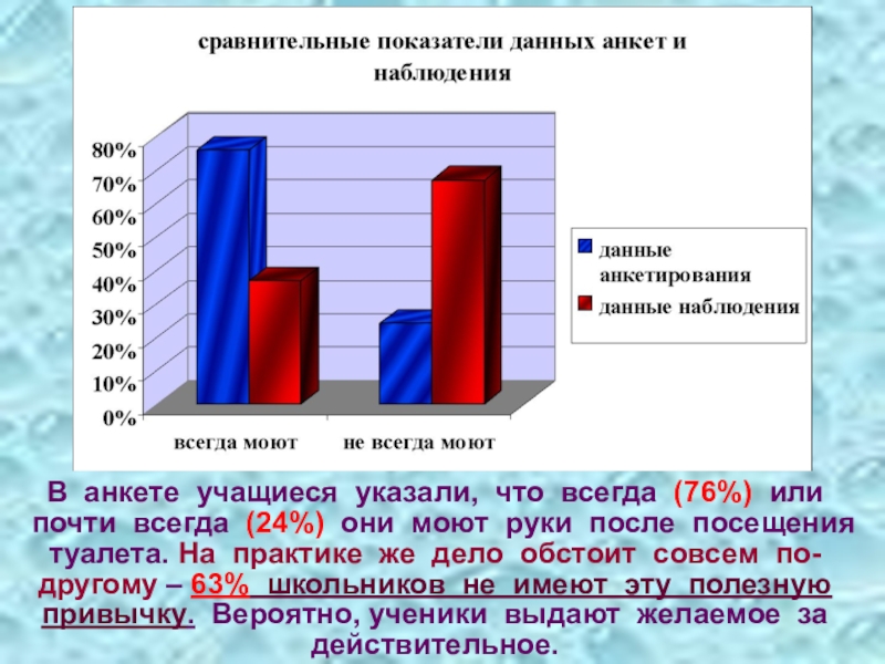 они моют руки после посещения туалета. На практике же дело обстоит совсем по-другому – 63% школьников не имеют эту полезную привычку. Вероятно, ученики выдают желаемое за действительное.