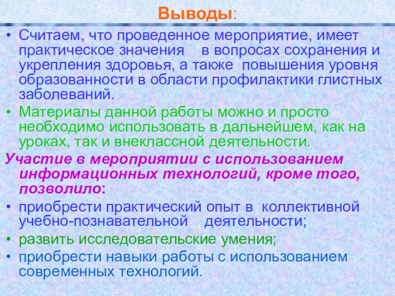 сохранения и укрепления здоровья, а также повышения уровня образованности в области профилактики глистных заболеваний.