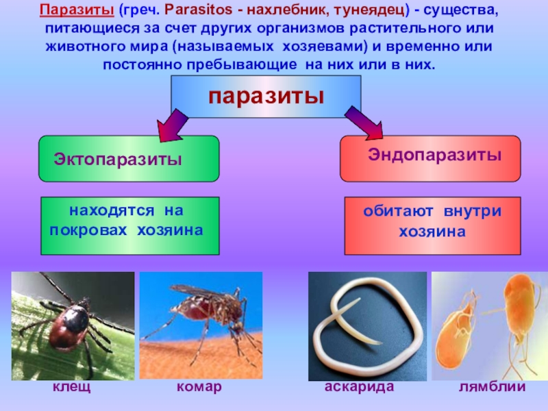 Слайд 5Паразиты (греч. Parasitos - нахлебник, тунеядец) - существа, питающиеся за счет
