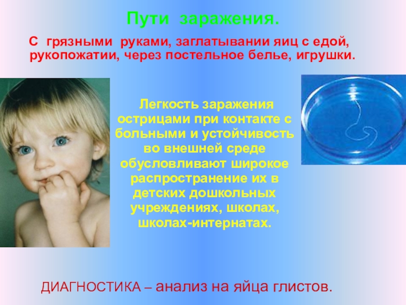 Легкость заражения острицами при контакте с больными и устойчивость во внешней среде обусловливают широкое распространение их в детских дошкольных учреждениях, школах, школах-интернатах.
