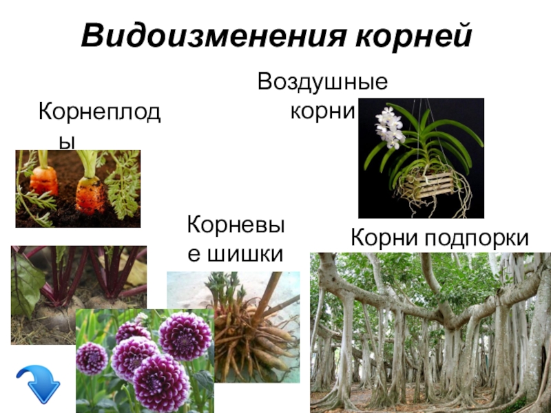 Видоизменения корнейКорнеплоды Корневые шишкиКорни подпоркиВоздушные корни