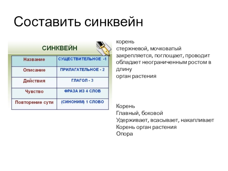 Составить синквейнКореньГлавный, боковойУдерживает, всасывает, накапливаетКорень орган растенияОпоракорень стержневой, мочковатый закрепляется, поглощает, проводит обладает неограниченным ростом в длину