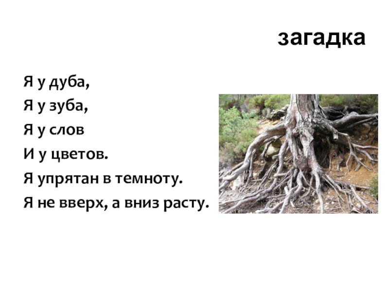 загадкаЯ у дуба,Я у зуба,Я у словИ у цветов.Я упрятан в темноту.Я не вверх, а вниз расту.