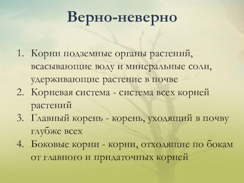 Верно-неверно Корни подземные органы растений, всасывающие воду и минеральные соли, удерживающие растение в почвеКорневая система - система