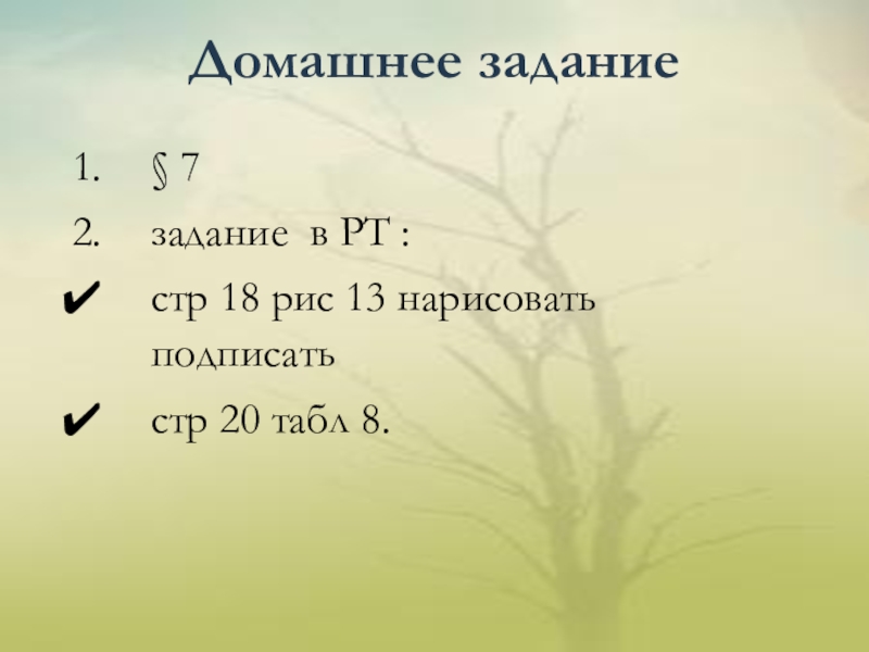 Домашнее задание § 7задание в РТ :стр 18 рис 13 нарисовать подписать стр 20 табл 8.