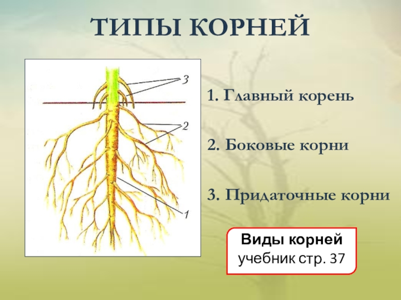 ТИПЫ КОРНЕЙ1. Главный корень2. Боковые корни3. Придаточные корниВиды корней учебник стр. 37