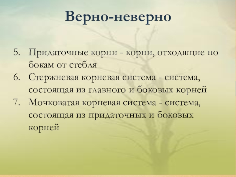 Верно-неверно Придаточные корни - корни, отходящие по бокам от стебляСтержневая корневая система - система, состоящая из главного