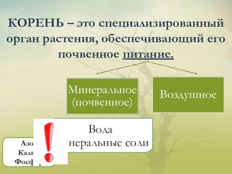 КОРЕНЬ – это специализированный орган растения, обеспечивающий его почвенное питание.Азот Калий Фосфор