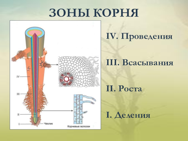 ЗОНЫ КОРНЯIV. ПроведенияIII. ВсасыванияII. РостаI. Деления