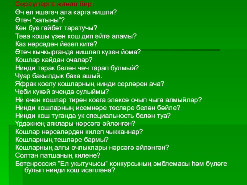 Кошлардан башка дөнья ничек күңелсез булыр иде. Кошларны саклыйк, аларга