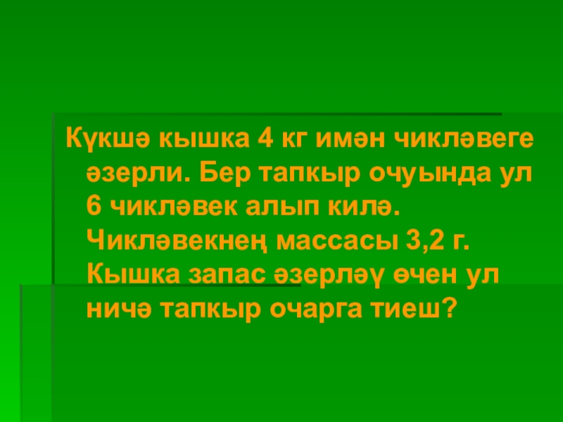 6 чикләвек алып килә. Чикләвекнең массасы 3,2 г. Кышка запас әзерләү өчен ул ничә тапкыр очарга тиеш?