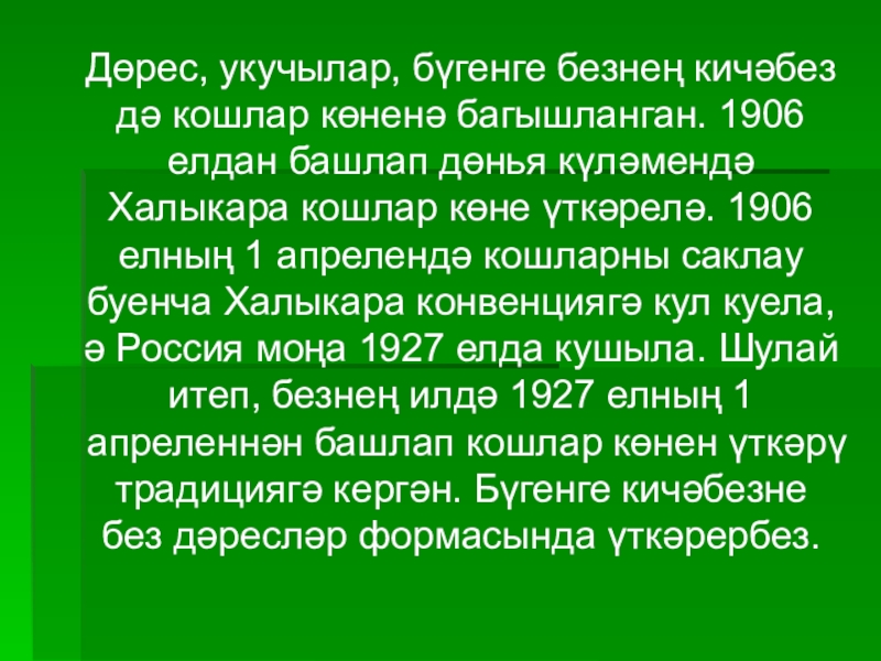 Слайд 3Дөрес, укучылар, бүгенге безнең кичәбез дә кошлар көненә багышланган. 1906 елдан