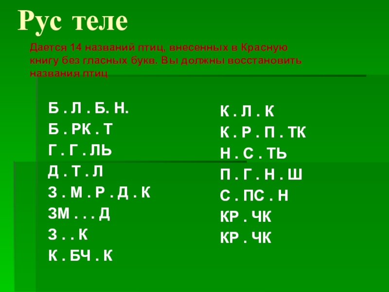 Дается 14 названий птиц, внесенных в Красную книгу без гласных букв. Вы должны восстановить названия птиц
