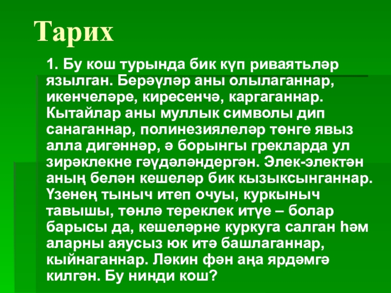 1. Бу кош турында бик күп риваятьләр язылган. Берәүләр аны олылаганнар,