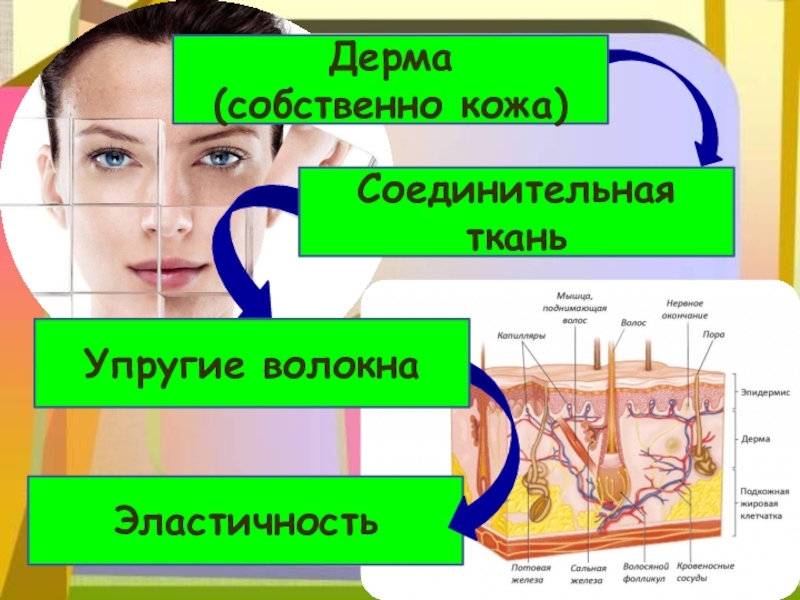 Эластичность Дерма(собственно кожа)Соединительная тканьУпругие волокна