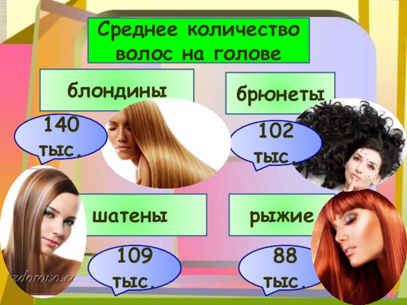 Среднее количество волос на головеблондиныбрюнетышатенырыжие109 тыс. 88 тыс. 102 тыс. 140 тыс.