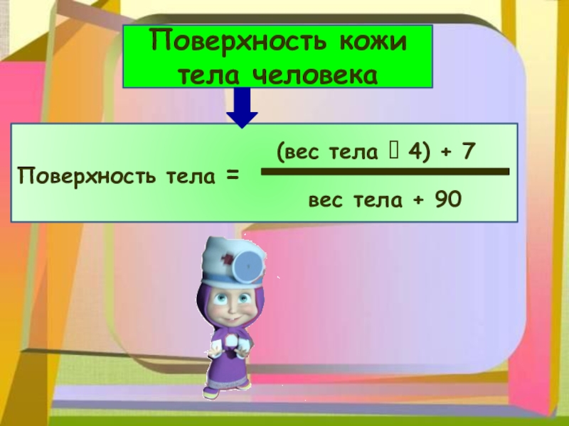 Поверхность кожи тела человекаПоверхность тела = (вес тела  4) + 7вес тела + 90