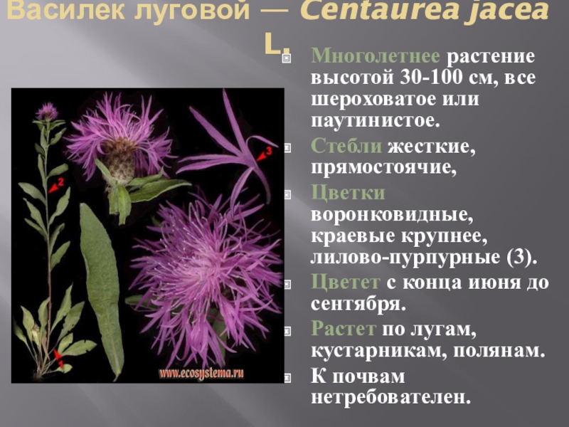 Соцветия — корзинки. Краевые цветки воронковидные, крупные, ярко-синие (3), внутренние (срединные) — фиолетовые (4).