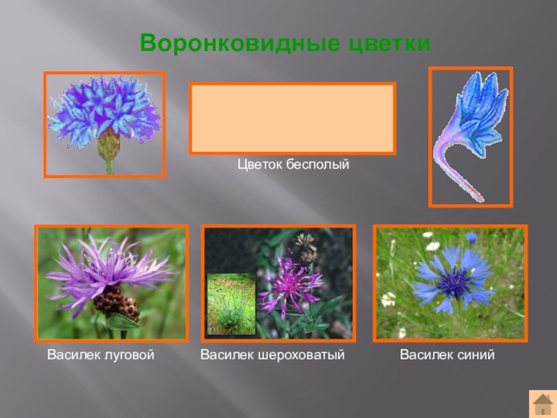 2. Воронковидные — бесполые, с длинной, изогнутой, кверху сильно расширенной трубкой венчика, с большим, чем у трубчатых цветков, числом зубцов вследствие частичного расщепления свободных окончаний лепестков.
