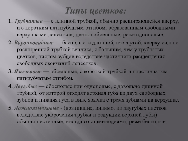 1. Трубчатые — с длинной трубкой, обычно расширяющейся кверху,