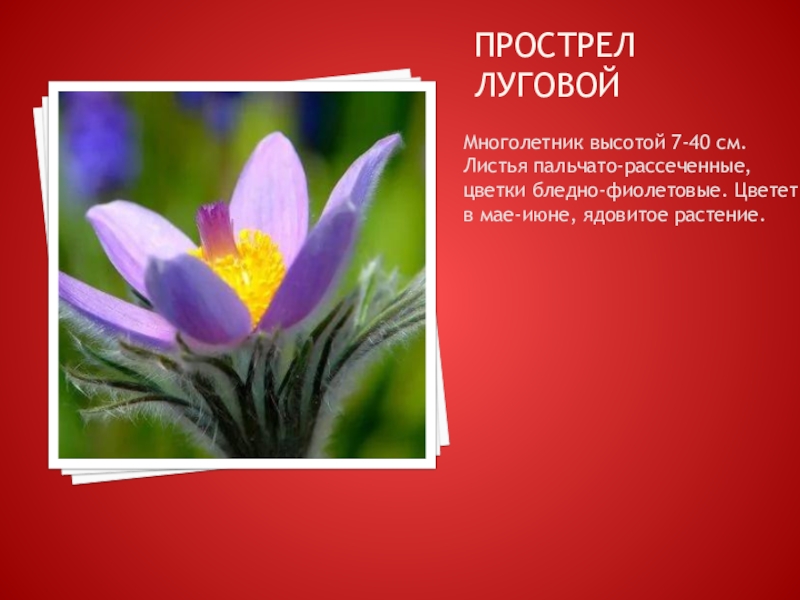 Многолетник высотой 7-40 см. Листья пальчато-рассеченные, цветки бледно-фиолетовые. Цветет в